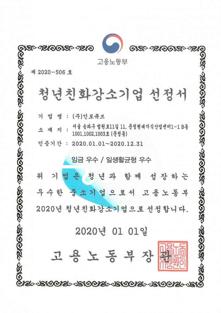 (주)인포큐브는 일반기업에 비해 임금, 일생활균형, 고용안전 등 복합적인 요소에서 우수한 평가를 받아 2020년 ‘청년 친화 강소기업’으로 선정되었습니다. 끊임없는 노력을 통해 앞으로 더욱 발전하는 인포큐브를 만들어 가겠습니다.